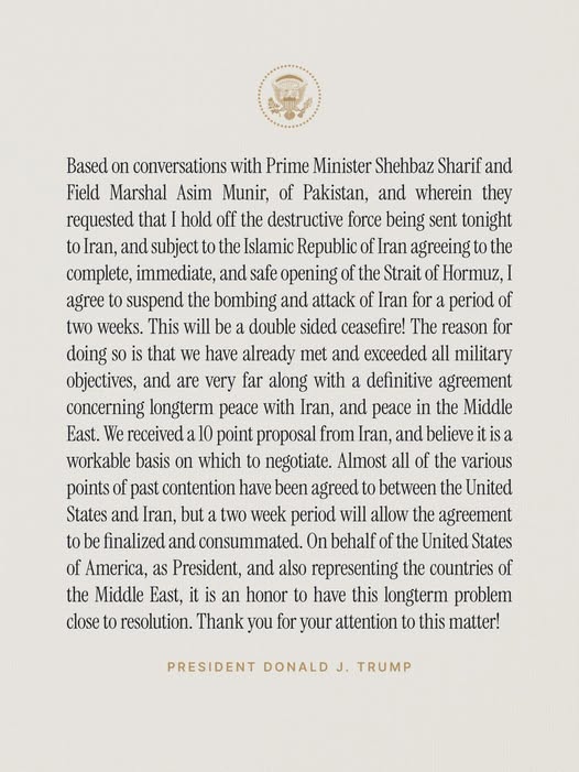 President Donald Trump has announced two-week ceasefire with Iran, a move confirmed by Tehran which also agreed to reopen Hormuz strait for oil vessels.