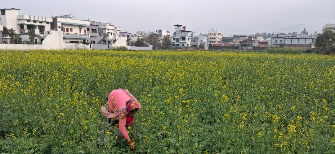 A woman working in a mustard field in Dehradun city on Wednesday. Such fields are rare in Dehradun which is rapidly turning into concrete jungles.