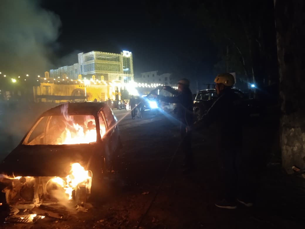 An Alto car on Friday caught fire in the middle of a busy road but timely action by the fire services saved the petrol tank from exploding near the Mangalore police station in Haridwar district of Uttarakhand.