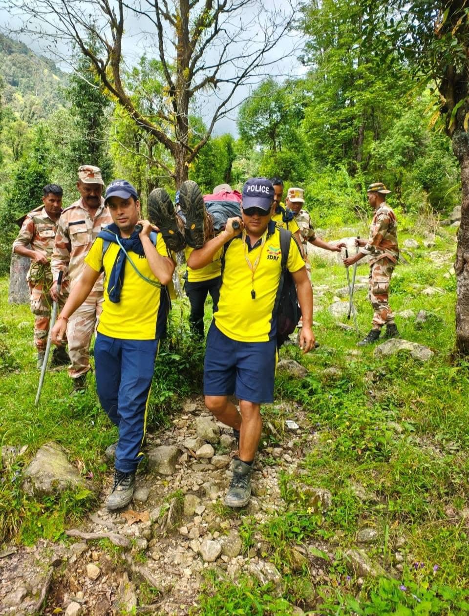 An injured trekker stranded near Lamgaon Belak in Uttarkashi district in Uttarakhand was brought safely by SDRF men on a stretcher covering a distance of about 10 kms through a difficult terrain. The unidentified trekker was later rushed to a hospital.