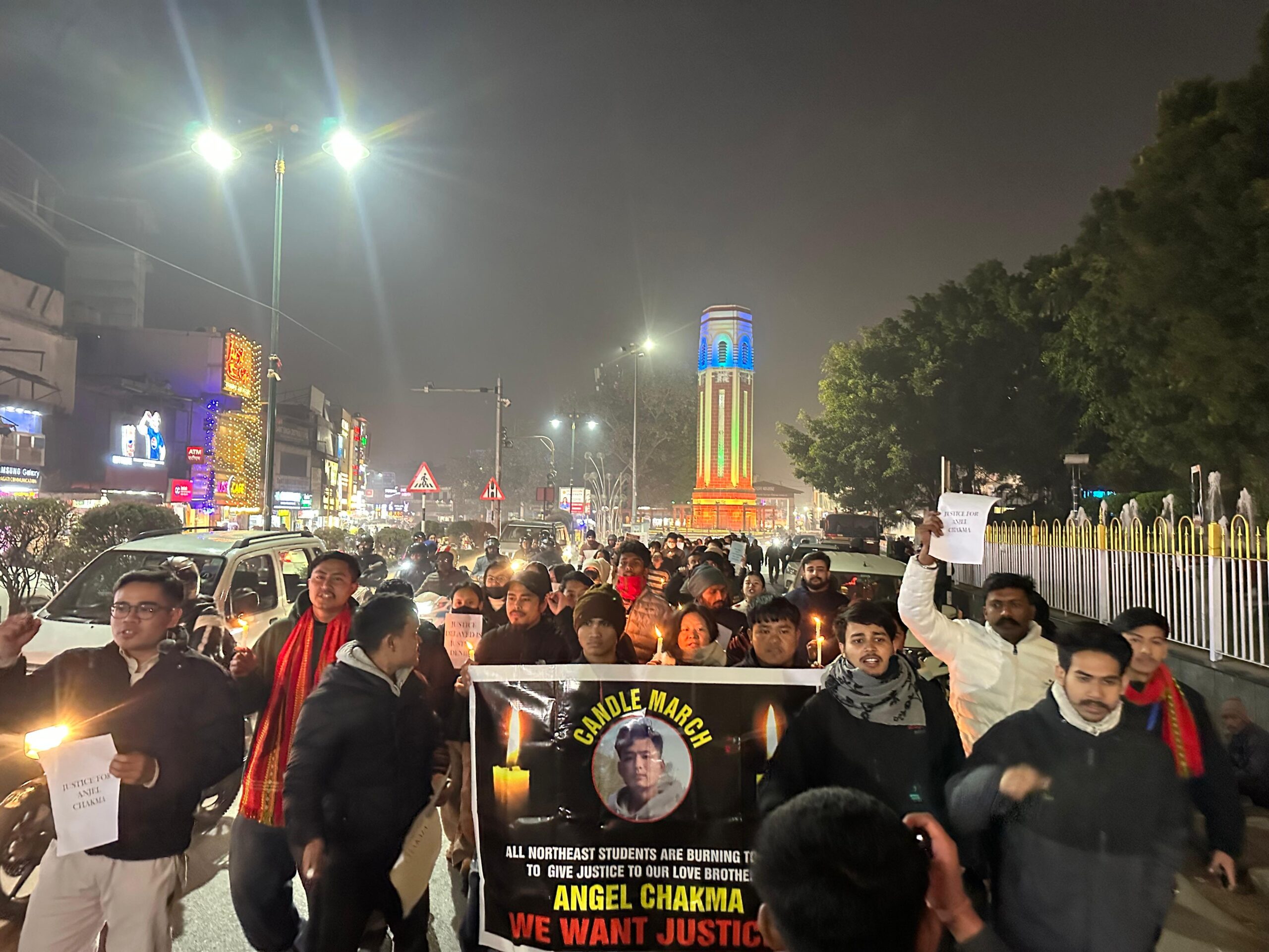 Caption: Students from the Northeast took out a candlelight march in Dehradun on Wednesday to protest the murder of Angel Chakma raising slogans against racial abuse and demanding justice.