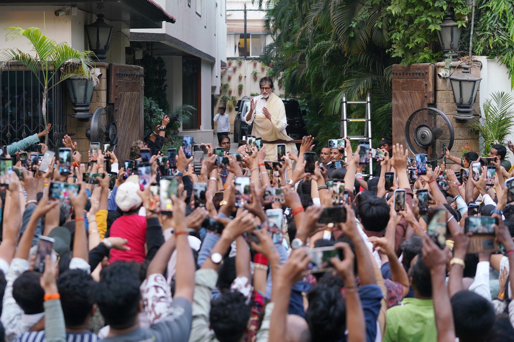 Amitabh Bachchan greeting people at his home in Mumbai. He shared the picture on social media early Monday. Big B usually greets people on every Sunday at his home Jalsa in Juhu in Mumbai. AB wrote on X: “the smiles that make me live .. and exist and work.”