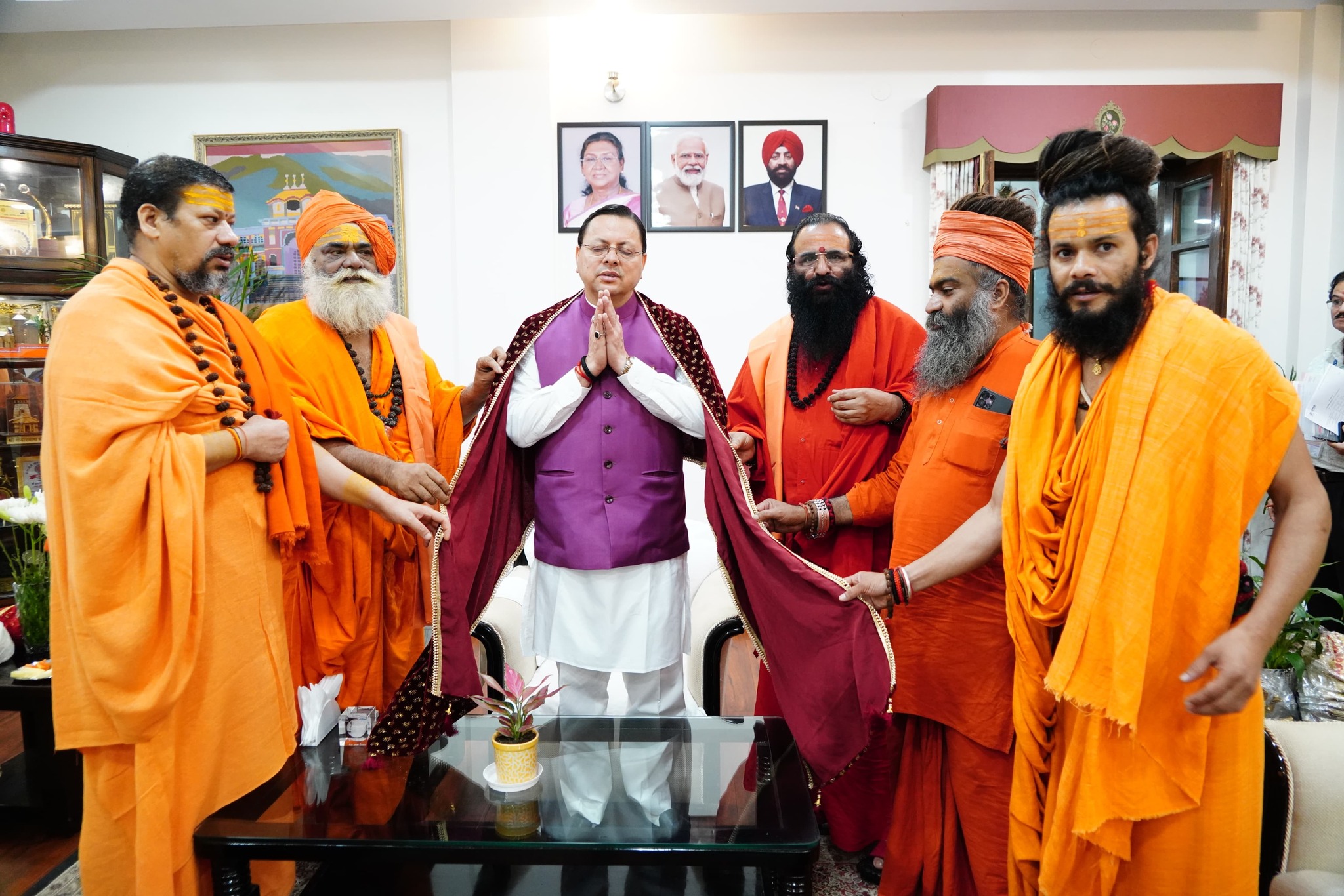 Uttarakhand Chief Minister Pushkar Singh Dhami on Friday met a group of top seers at his official residence in Dehradun. “At the official residence, Acharya Mahamandaleshwar Swami Kailashananda Giri Maharaj Ji, President of the Akhara Parishad Swami Ravindrapuri Maharaj Ji and General Secretary of the Akhara Parishad Shri Harigiri Maharaj Ji were welcomed and their blessings were received,” Dhami said.