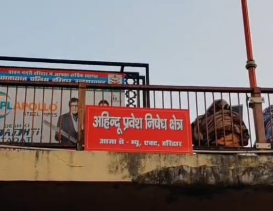 The Ganga Sabha, the organization that manages and maintains Har Ki Pauri and the surrounding ghats, has put up these boards on all the routes leading to the main bathing ghat as well as on the railings and pillars of the bridges. “These signboards have been put up to alert people that the entry of non-Hindus is banned at Har-Ki-Pauri,” said Tanmay Vashishth Secretary Ganga Sabha.