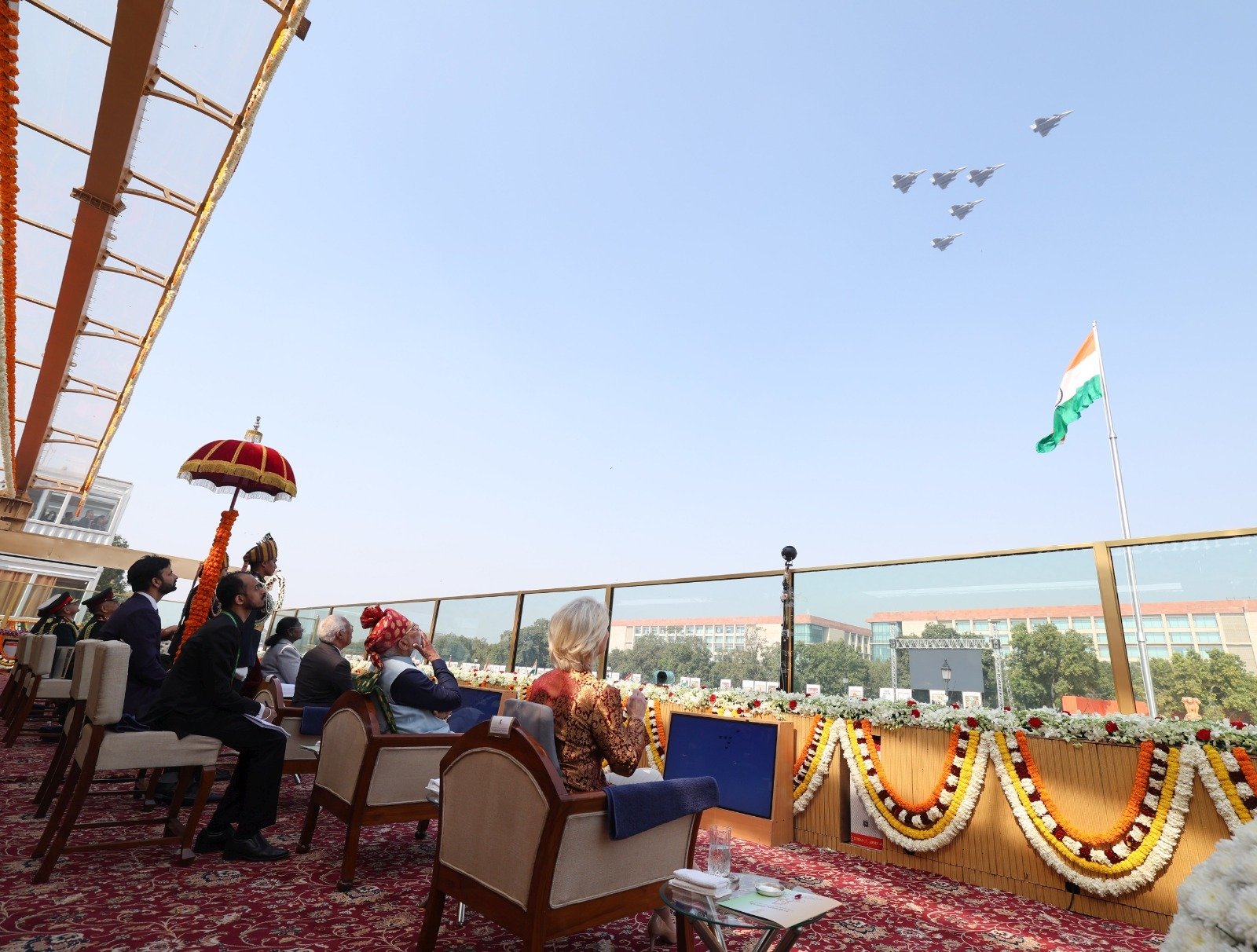 President Droupadi Murmu unfurled the national flag and took salute as the national anthem was played amidst the boom of 21 guns salute. Defence helicopters showered petals at the impressive march past.