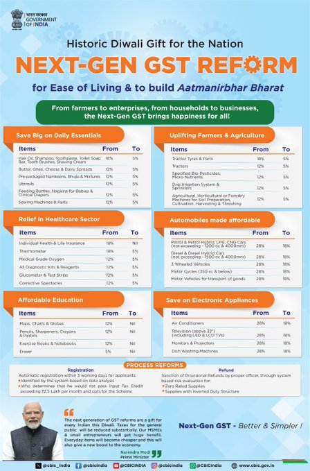- The changes in GST rates of all goods except pan masala, gutkha, cigarettes, chewing tobacco products like zarda, unmanufactured tobacco and bidi, will be implemented with effect from 22nd September 2025.
