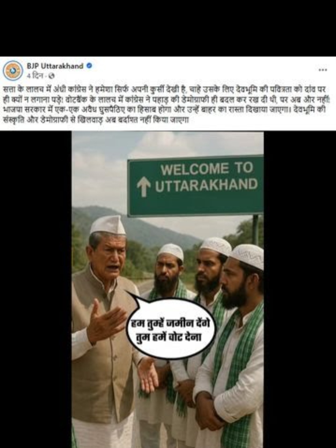 The twenty-nine-second reel states, “The Congress, blinded by its lust for power, has always only cared about its own chair, even if it means compromising the sanctity of Devbhoomi. The reel further says, “In its greed for vote bank politics, Congress has completely changed the demography of the hills. Under the BJP government, every single infiltrator will be held accountable and shown the door. Tampering with the culture and demography of Devbhoomi will no longer be tolerated.”