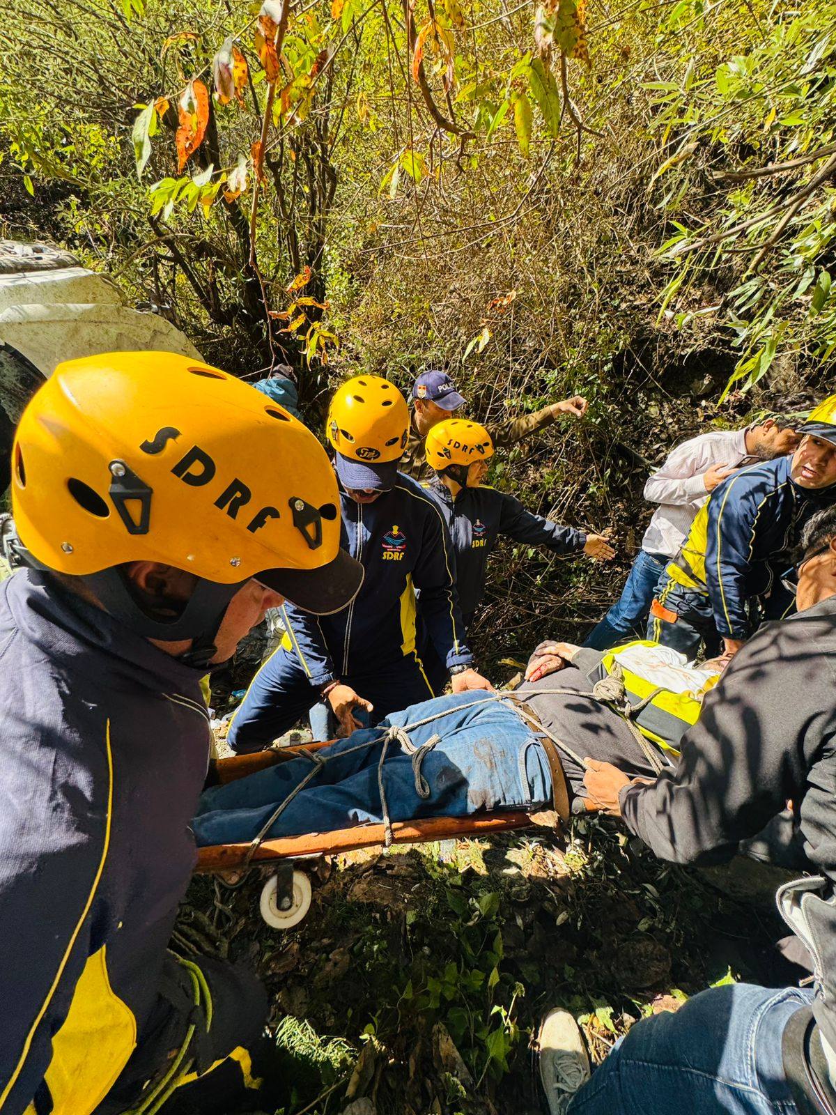 An SDRF team took swift action, reaching the vehicle that had plunged into a deep gorge to conduct a rescue operation. Working under challenging conditions, the team safely extricated two injured individuals from the vehicle—which had fallen approximately 60–70 meters—and, after administering first aid, sent them to a nearby hospital.